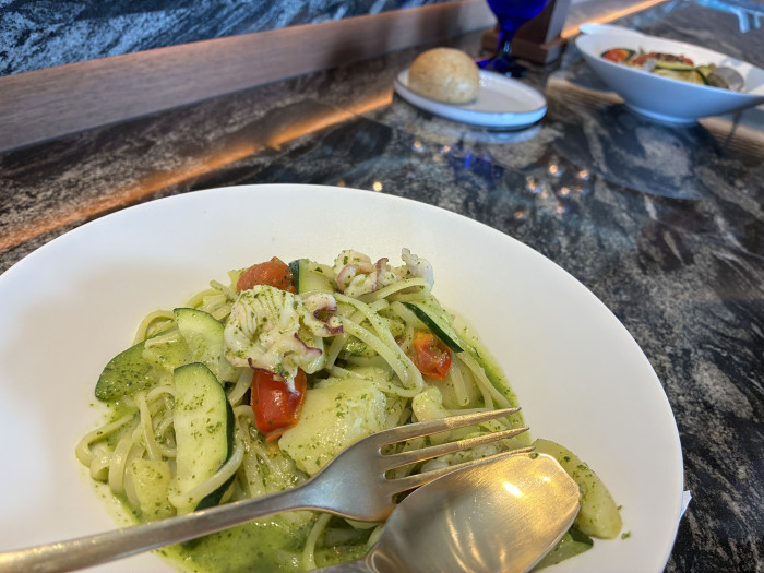 パスタからは、「蛸と夏野菜のジェノベーゼ」をチョイス。トマトやきゅうり、ズッキーニでさっぱりとみずみずしさを。厚切りのタコで食感も楽しみます。少し平たくて太めの麺が、ソースとまたよく絡んで美味しい♪