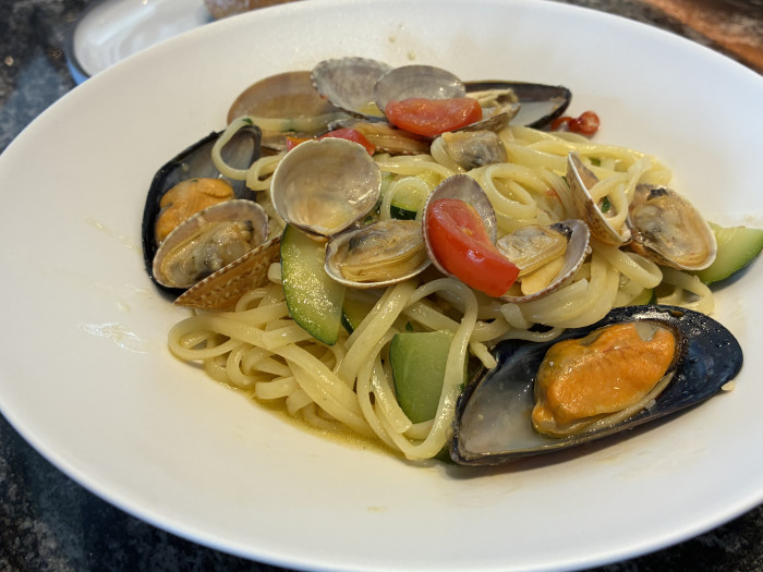 「浅利とムール貝 ペスカトーレビアンコ」。海の幸たっぷり!シンプルな味付けが、魚介の風味を際立たせます。
