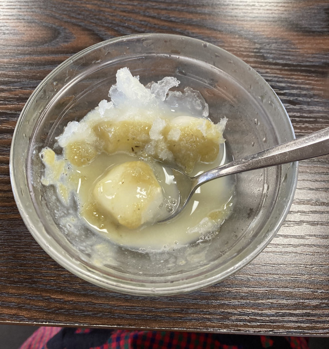 繊細な氷を崩しながら食べていくと、餡の中からお餅が出てきました。