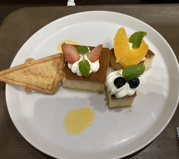 よく見ると正方形にカットされた3つのプリンの辺が三角形を成しており、