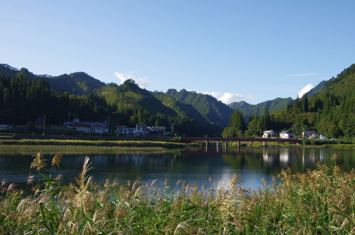 赤い橋が、景色のなかでひときわ強く目を引きます。