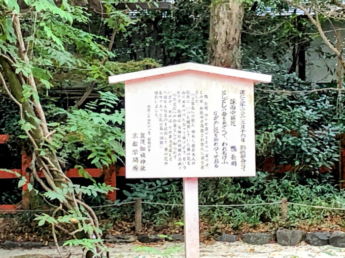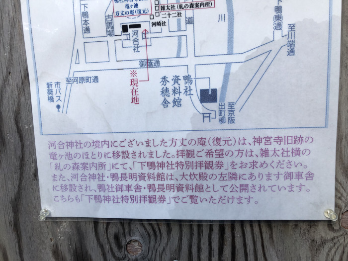 そのうちの一つとして、下鴨神社の摂社・河合神社に長明の庵「方丈」が復元されていましたが、現在は移転し、方丈のあった場所に案内板が立っていました。