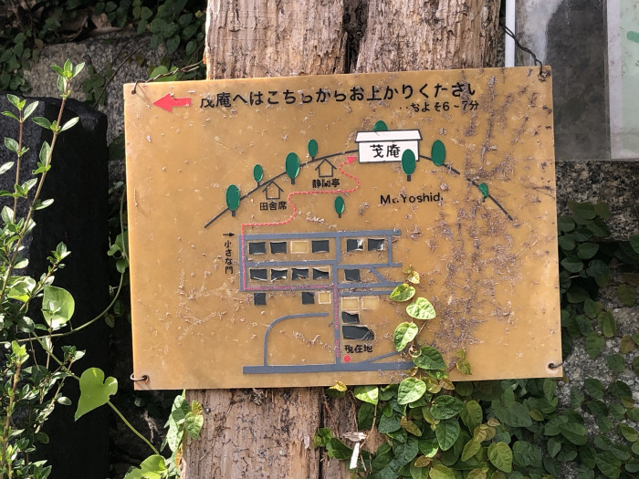 案内板は、吉田山山頂にあるカフェ茂庵のものですが、茂庵の下に住宅街が描かれているのがわかります。