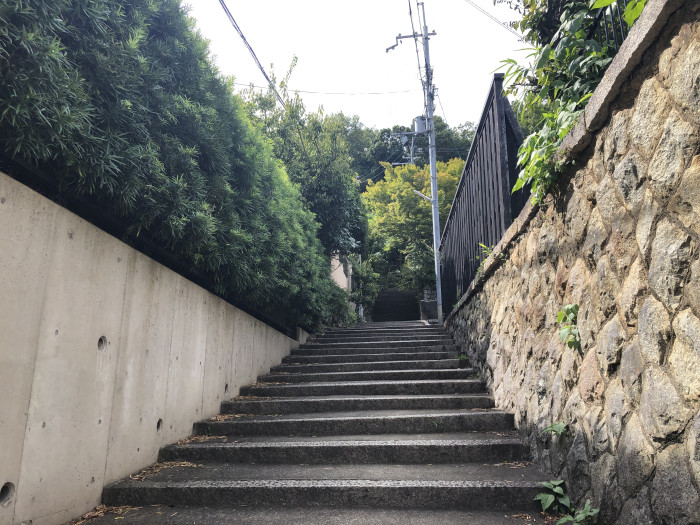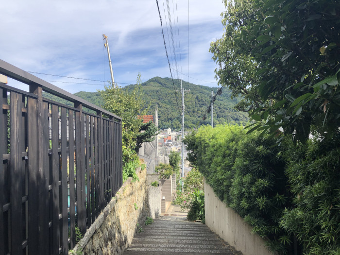 谷川住宅群へは、長い階段を登ります。