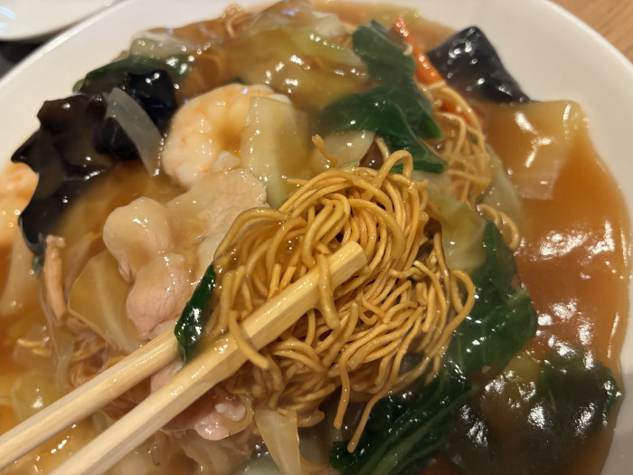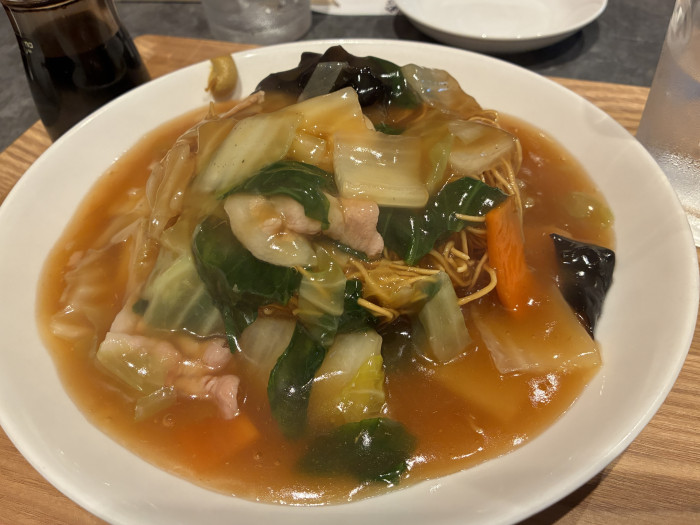 イカや海老など魚介系含め、具材も大きめにカットされていて食べ応えあり。餡に溺れてしっとりと化しつつある麺を頬張ります。餡はコクがあり濃いめの味付け。これにご飯がついても進みそう…野菜がたっぷりなので、ボリュームたっぷりだけど罪悪感少なめ♪