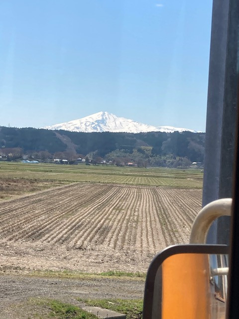 天気がいい日ですと…鳥海山ろく線にも入っている「鳥海山」を発見できます。可愛らしいかたちですね。豊かな水などの恩恵を与えてくれる鳥海山は、今日も我々を見守っています。