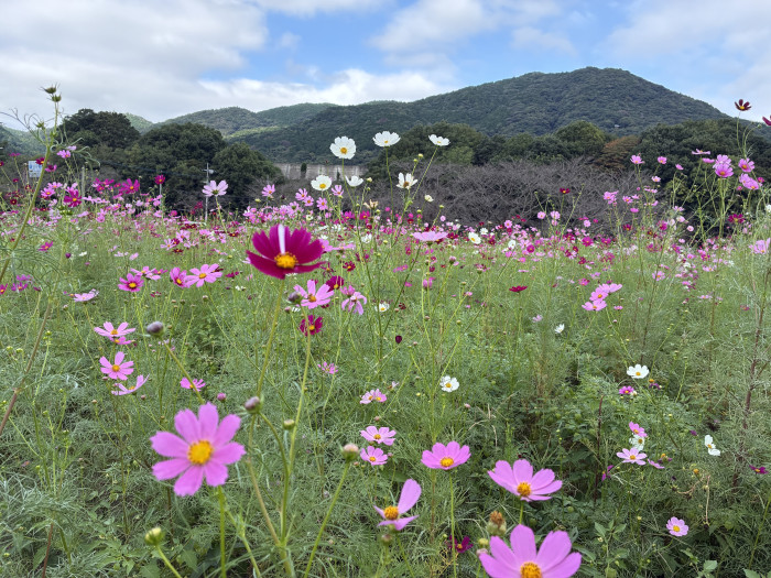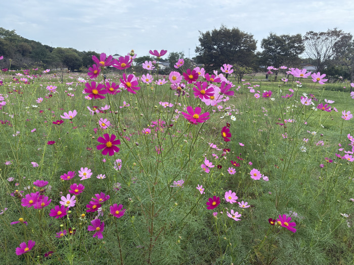 約3,5ヘクタールの敷地には区画ごとに濃いピンク、薄めピンク、白のコスモスが約33万本!だいたい毎年、10月下旬が見頃といわれています。