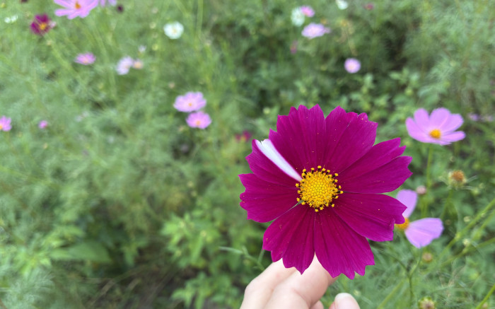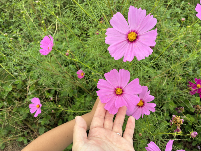なんだか今年はいつもより大ぶりに見えるような…?ぽってりと存在感のある花々。背が高く、ひまわりを眺めているときの視線くらいの高さ。可愛らしいけど逞しさも感じる秋の桜、コスモス。