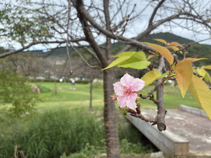 おまけ。こちらはポツンと開いた…桜!?返り桜というものでしょうか。桜や菜の花で溢れる春もまた楽しみです。遊具もあるので子どもたちを遊ばせつつ、ぐるっと回ると程よいウォーキングコースにもなる金立コスモス園。今年も綺麗なコスモスで溢れています。
