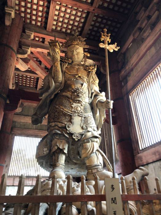 また大仏殿の後方には、仏教において東西南北を守る四天王のうち、広目天と多聞天の像が安置されています。こちらは多聞天。北方を守る神様です。