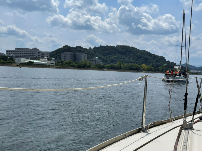 約1時間のヨット体験は、鳥取大学医学部付属病院や米子城跡を左に見ながら、安来方面へと直線的に進んでいきました。