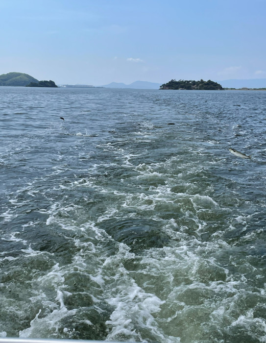 最後尾に乗ったのですが、スクリューが作る波に驚いた魚たちがたくさん飛び跳ねていました。