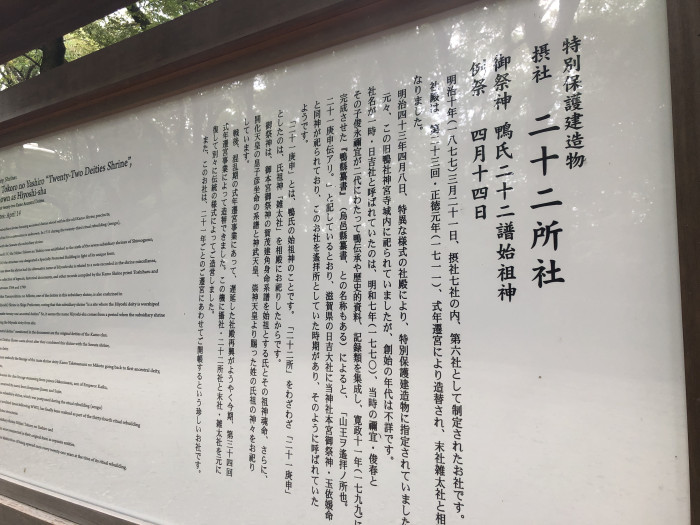 二十二所社は、最後に加わった日吉社の遥拝所だったそうで、このお社自体が「日吉社」と呼ばれることもあったのだとか。祀られているのは鴨氏の祖先で、「鴨氏二十二譜始祖神」という神様だそうです。二十二譜とは鴨氏の系譜を表すとのこと。