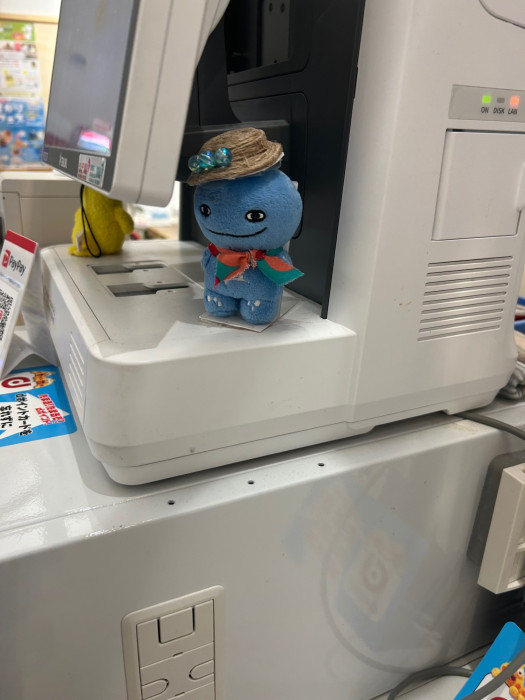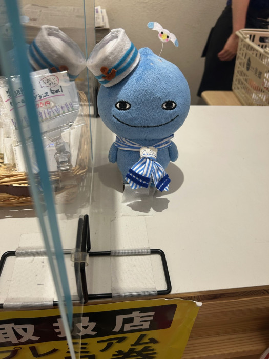 一か所目は「道の駅美郷」です。写真はその…レジです。そして、この青くて可愛らしい妖精は「美郷のミズモ」です。