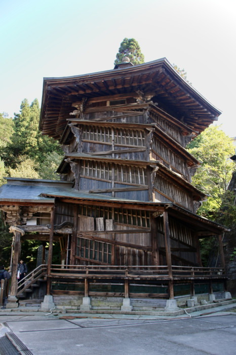 階段を登った後、左の道を進むと木造の建物「さざえ堂(円通三匝堂)」が現れます。