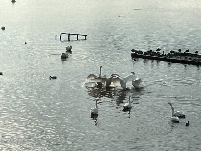 同じく渡ってきたカモもたくさん泳いでいます。カモはコハクチョウが掘った水草を横取りしようと近くにいるのですが、時々怒られて追い払われていました。