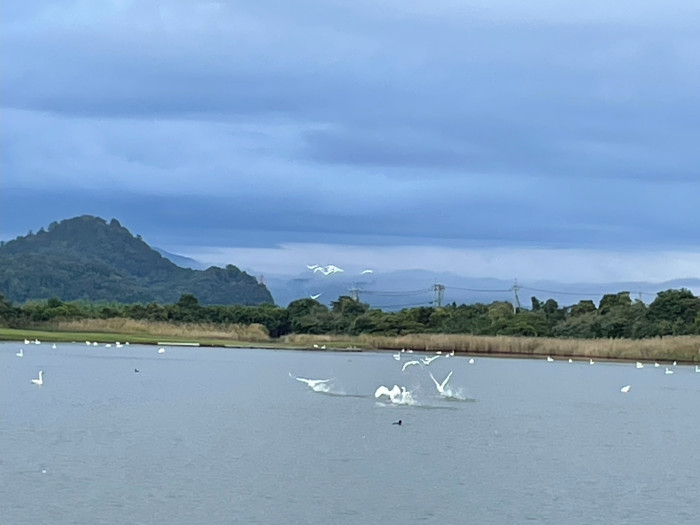 けれど面白いことに、中には「やっぱりやめた」とばかりに引き返すコハクチョウがいたり、一部が別の方向に分かれて飛んで行ったりと、結構自由なコハクチョウ社会の様子が見て取れました。