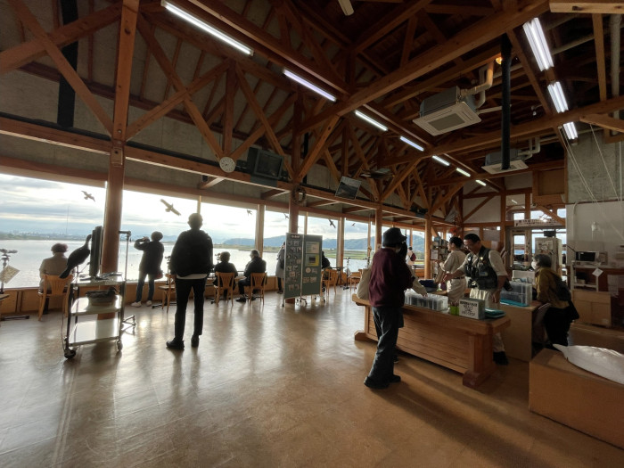 約470羽のコハクチョウの目覚め、そしてこれから餌場へと飛んでいくまでの興味深い行動を詳しく解説していただいたのは、総括指導員の桐原さんと指導員の神谷さんです。