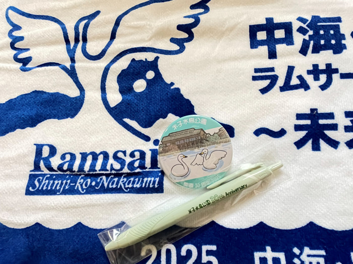 記念にタオルと缶バッチ、ボールペンをいただきました。
