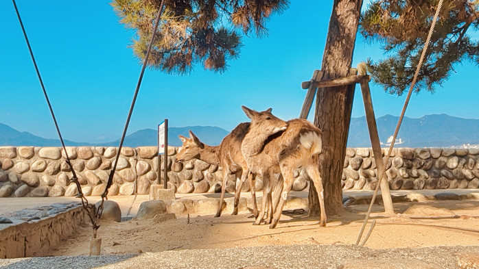 島内では出迎えてくれるように、可愛い鹿たちが色んなところを歩き回っています。