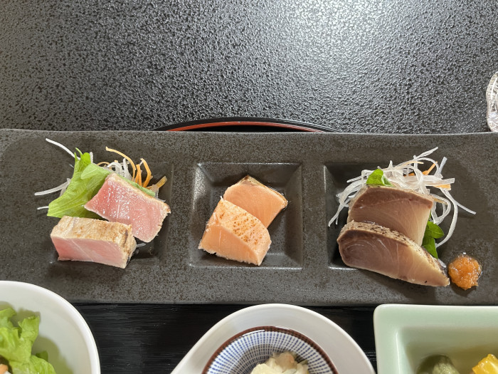 「塩糀炙りの刺身」は、ぶり・さけ・まぐろの三種盛り。