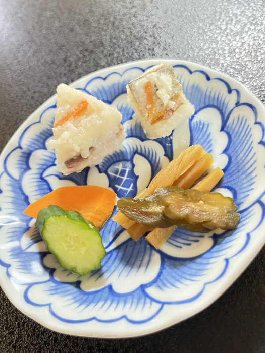 お漬物盛り合わせでは、お店の漬物が一口ずつのっています。金城漬けやかぶら寿し、大根寿しとちょっとずつ食べられるのが楽しいです。気に入ったら帰りに買って帰ることもできます。