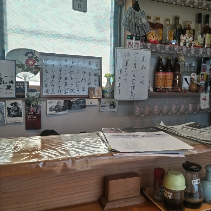 夜はスナックになるらしくお酒なども並ぶ。カウンター席が6席しかないので入れたらラッキー。