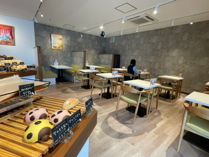 店内奥にはテーブルと椅子が約30席あり、購入したパンをドリンクと一緒に楽しめ、喫茶店より利用しやすいカフェとして利用できのも人気です。