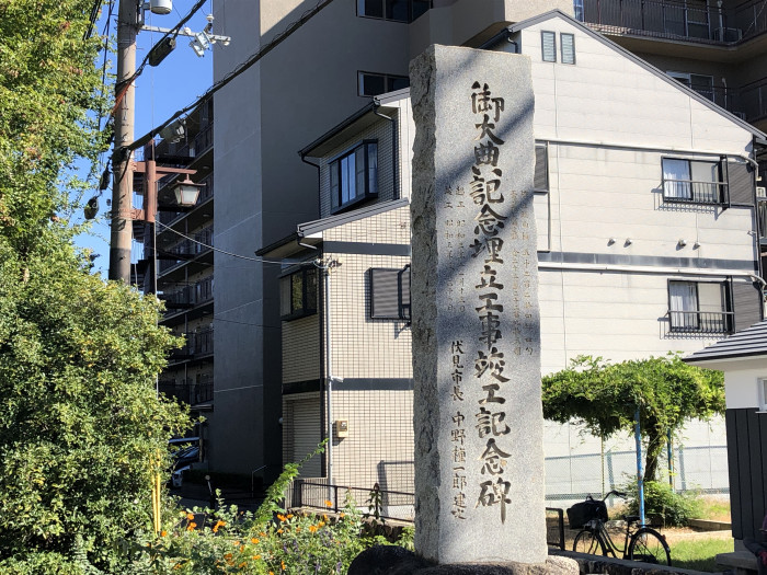 橋の脇に建っているのが、「御大典記念埋立工事竣工記念碑」。川幅を整備するために行われた工事だそうです。大典とは、昭和4年11月に行われた昭和天皇即位大典のことで、この儀式に合わせて工事を進めたのだとか。