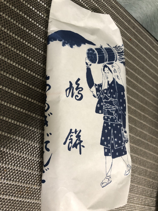 今回は、本店で購入した双鳩堂の名物「鳩もち」をいただきました。包み紙には、大原女が描かれています。