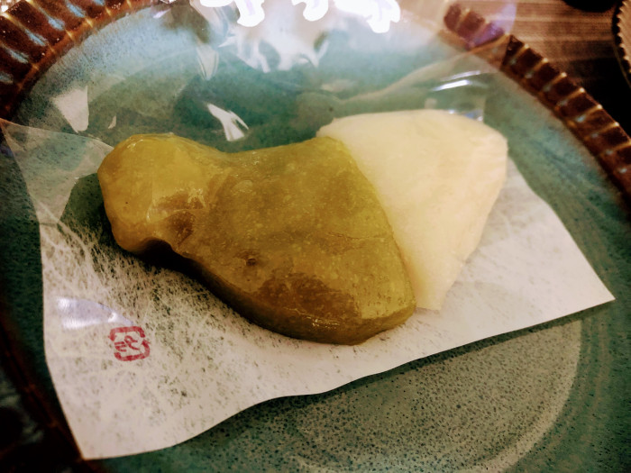 白と抹茶(緑)とニッキ(ピンク)の3種類があります。ういろうみたいにモチっとした食感の、素朴なお菓子です。