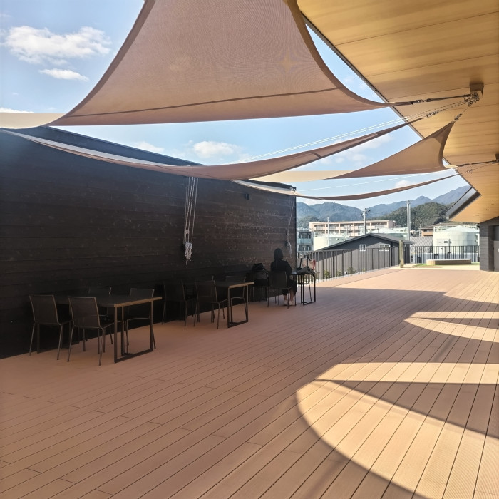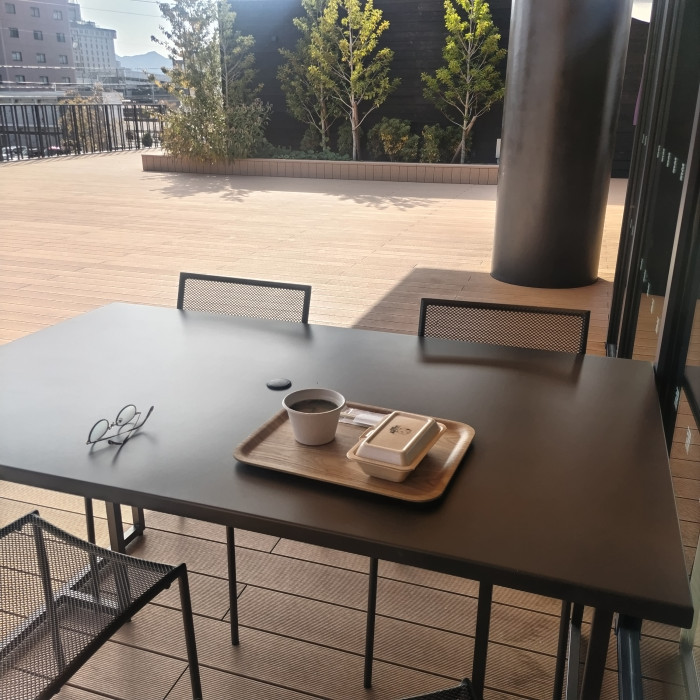 館内なら持って移動して食べてもいいそうです。お天気もよく気持ち良い。