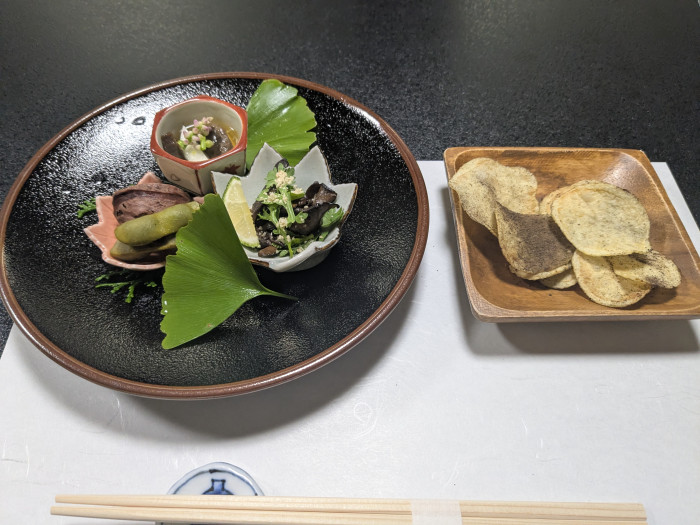 こちらは、香茸ポテチと栗の渋川煮、カンゾウタケの酢の物、舞茸があり大変美味しかったです。