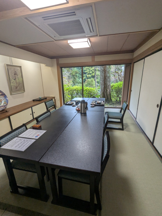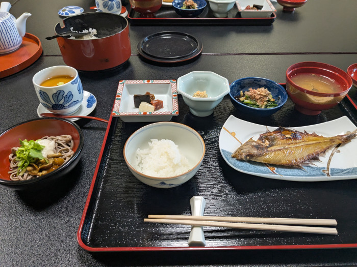 翌朝は、焼き魚と出雲そば、精進茶碗蒸しの豪華な朝食でした。