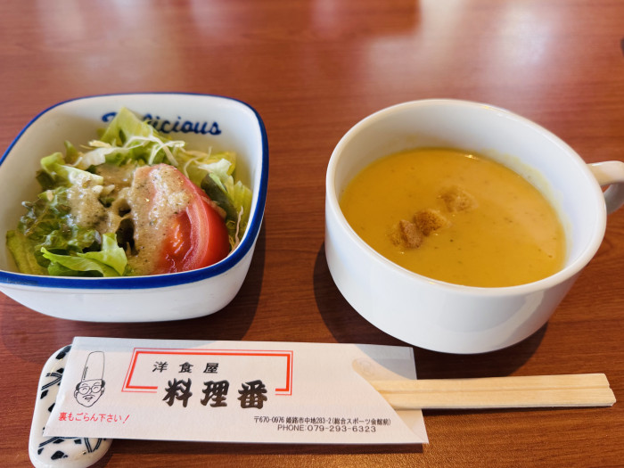 すぐにサラダとスープが出てきます。サラダのドレッシングは自家製なのでしょう、酸味と甘みが絶妙でした。スープはこの日はカボチャのポタージュ。カボチャ本来の甘みとコクがありおいしい♪