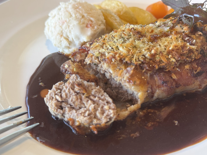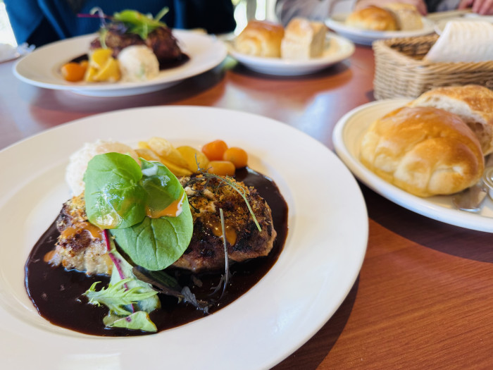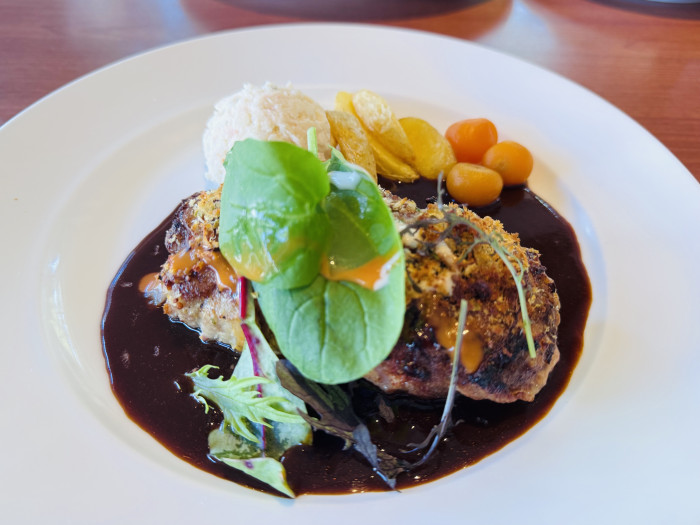 この日のメインは、ハンバーグを豚肉に包んで焼き、さらにパン粉をまぶしたもの。肉肉しいハンバーグとカリカリに焼いた豚肉。こんな形でハンバーグをいただくのは初めてでしたが、食感も味もさらにソースとの相性抜群で、食べ応えも十分です。