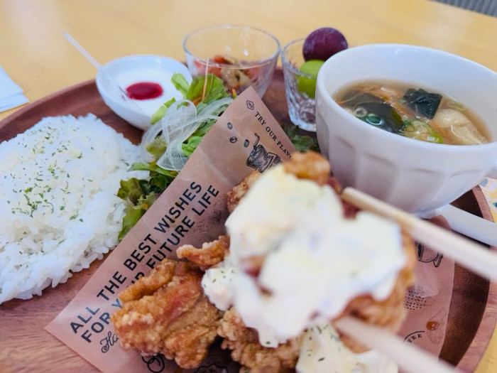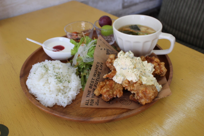 ランチで一番人気の「チキン南蛮漬けプレート」1,300円(税込)をいただきました。チキンは「油淋鶏」や赤穂のソウルフード「レモン漬け」にも変更可能。出汁の効いた味噌汁付きでほっこりします。