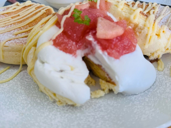 こちらは「紅玉リンゴのパンケーキ」。ふわっふわでシュワって溶けるパンケーキが3枚も入っています。紅玉リンゴの赤みがとても映えます。りんごのパンケーキって珍しいですよね。