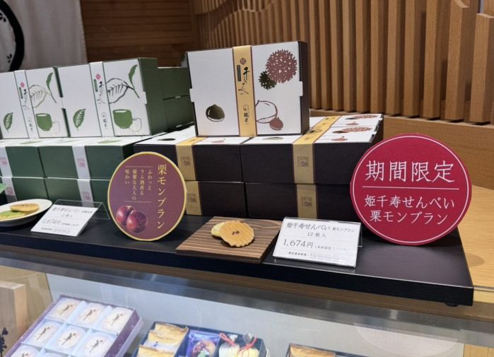 また、「千寿せんべい」はミニサイズのものや、素材や製法にこだわったプレミアムなもの、また抹茶・苺・キャラメル林檎などの季節限定フレーバーも展開しています。この日は秋限定の「栗モンブラン」味が店頭に並んでいましたよ。