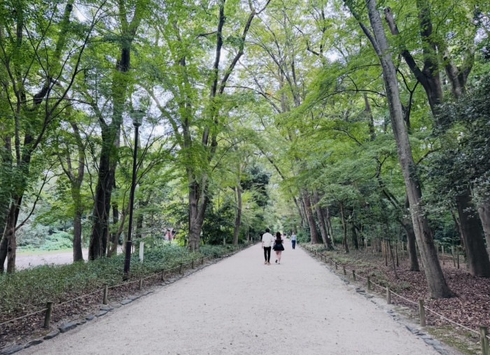 鳥居を抜けると、約12万㎡の原生林のある「糺の森」。緑に包まれた神聖な空気が漂う場所です。