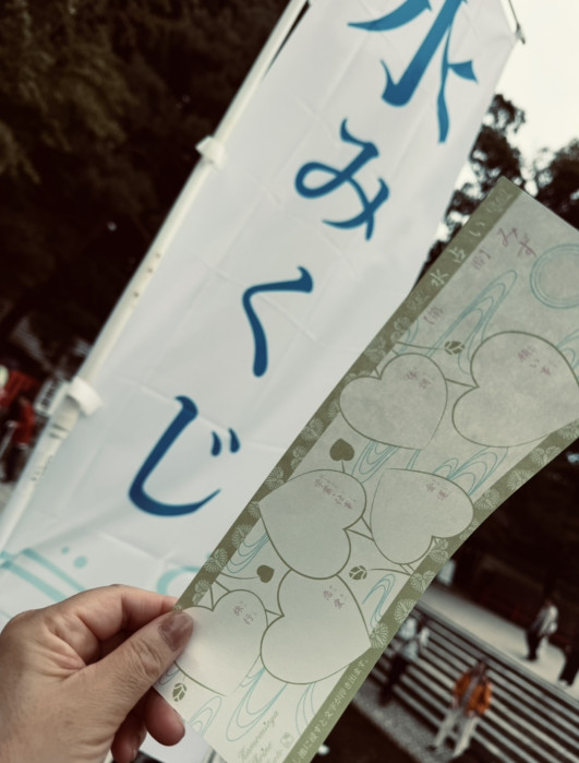 水みくじもやってみました。御手洗池に浸すことで文字が浮かび上がる神秘的なおみくじで、運勢や願い事が水の力で現れます。料金は300円で、境内の授与所で受け取れます。