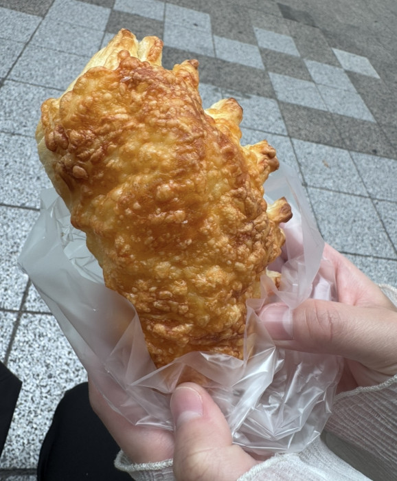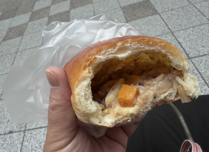 中にはたっぷりの具が。濃い目の味付けのジューシーな具材とほんのり甘めのパン生地がよく合います。とてもおいしくいただきましたよ。