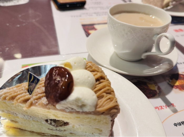 わたしはモンブランとカフェオレにしました。食器も昭和チックなのがいい。モンブランの栗は大きくて満足感あります。