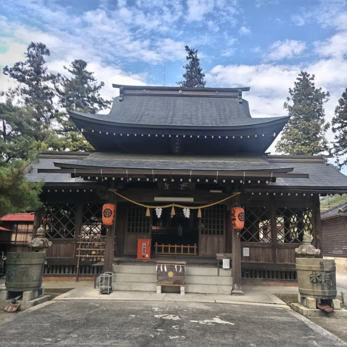 本殿は二間社流造りで、屋根は桧皮葺きです。本殿の周囲に配されている13個の変化に富んだ蟇股は珍しい図柄とともに室町時代の特色がよく出ています。立派な斜めになった松が印象的です。