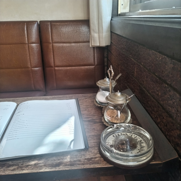 窓際の席に。置いてあるお砂糖入れもレトロでいいですね。メニューが