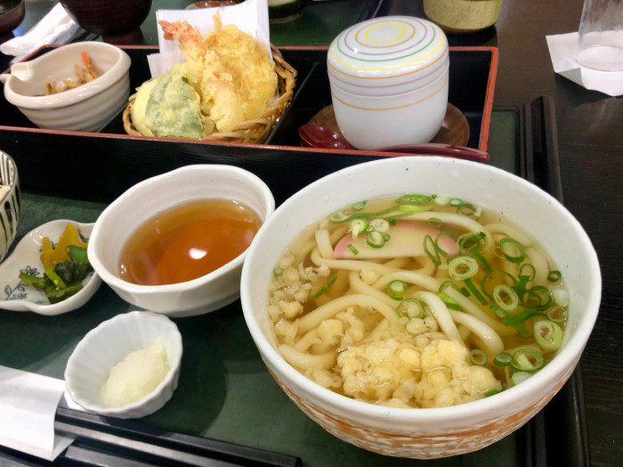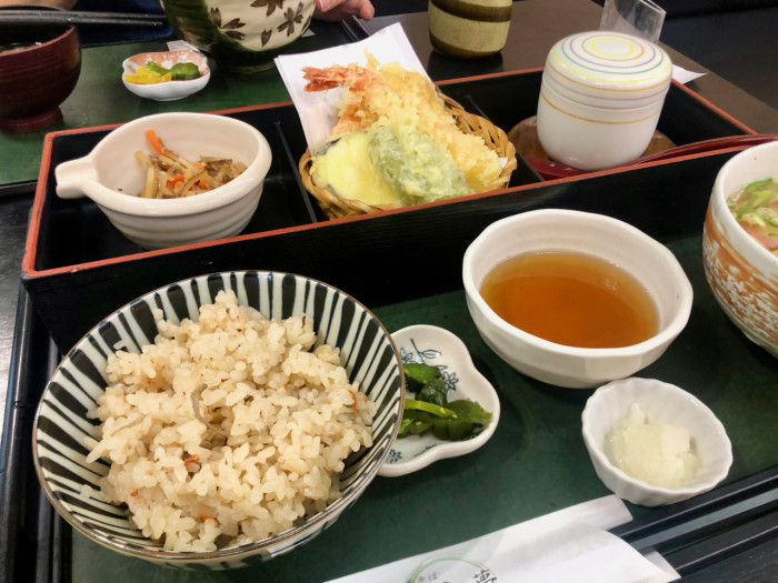 この日は炊き込みご飯、うどん(そば)、天ぷら、茶碗蒸し、一品、漬物がセットになってお得な「舞御前」を注文。美味しゅうございました。