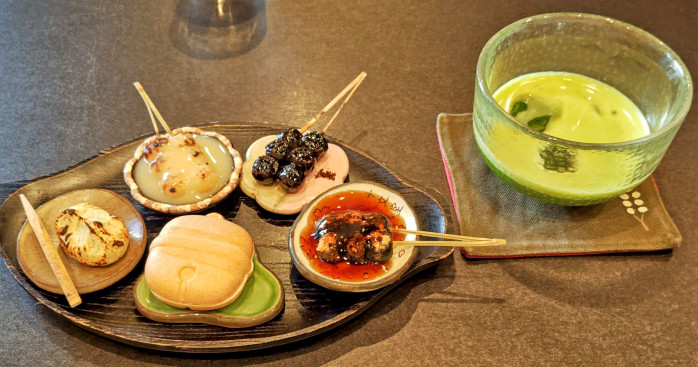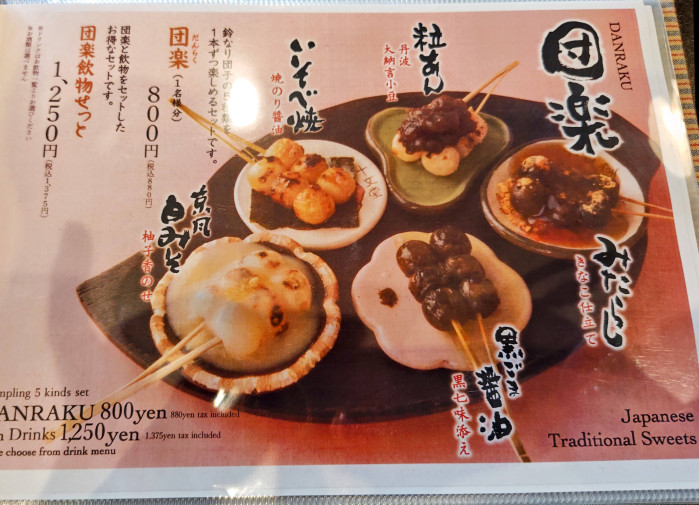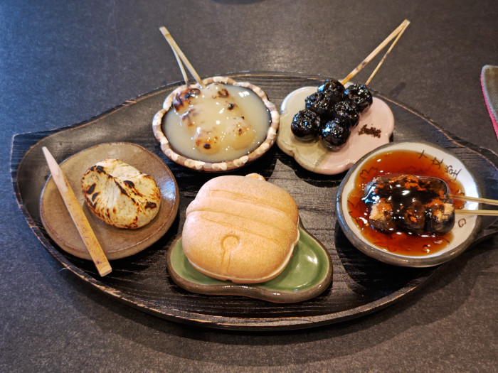私は、好きなお団子3種類と粒あん最中・炙り栗きんとんとお抹茶のセット「だんだん」を注文しました。