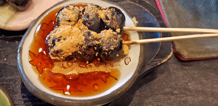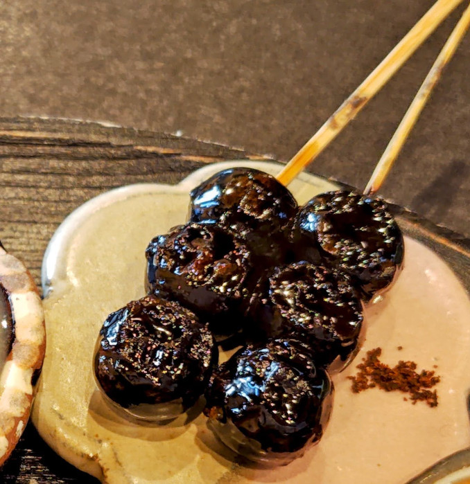 まずは定番のみたらしきなこから。 ひっくり返すとしたにきなこが敷いてあるので、少しずつきな粉をつけながらいただきます。