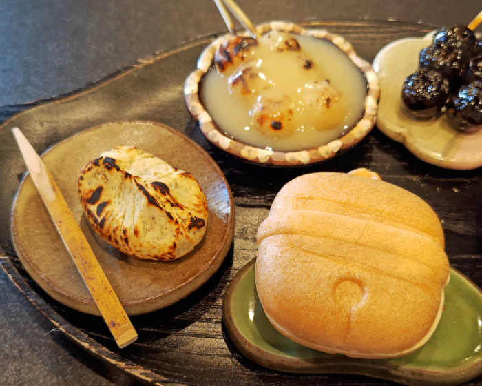 直系12mmというミニサイズのお団子が串に連なっていて、人気の京風白みそ・みたらしきなこのほか、黒ごま醤油・いそべ焼・粒あんの5種類があります。