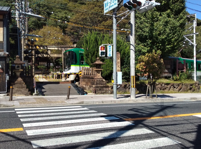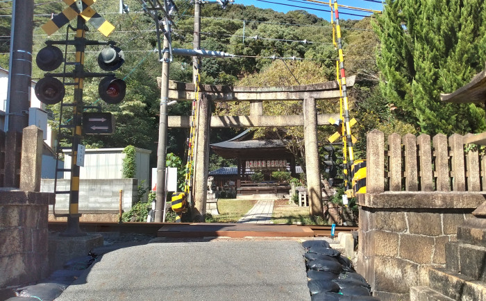 参道に少し掛かっていて、境内を電車が走っていることになるようです。